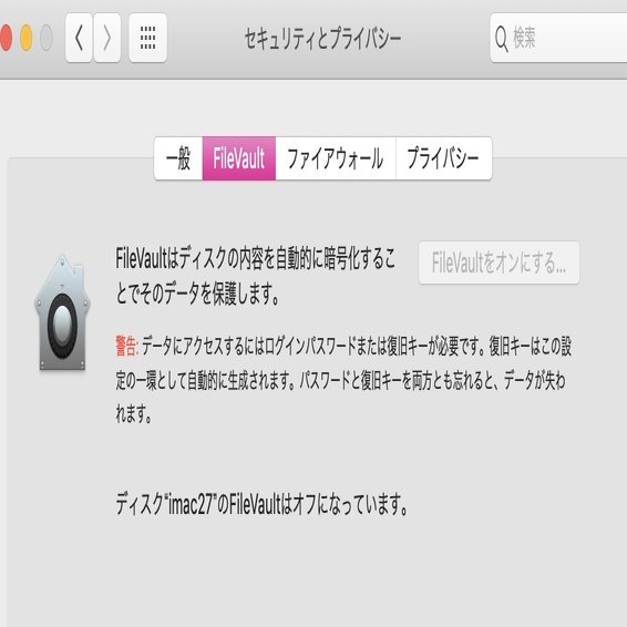で、以下のように「オフ」になっていること。右側の「FileVaultをオンにする」がグレーになっていればOK。暗号化されていないことが条件です。