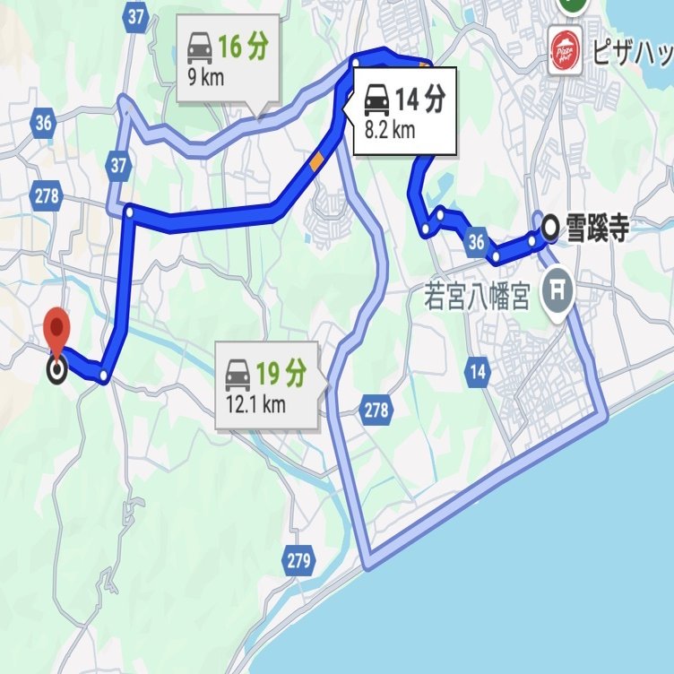 一見、最短距離のように見える西に向かうルートは住宅地を通るので道が細くて運転しにくく時間がかかります。