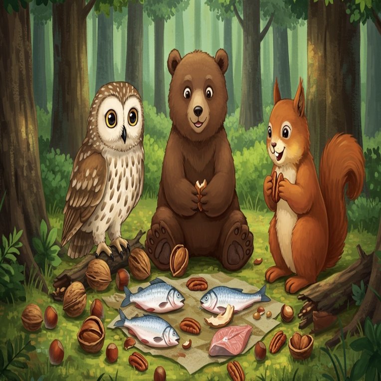 議論の末、動物たちはそれぞれの意見を尊重し、協力して冬の食糧を調達することに決めました。リスは木の実を集め、クマは木の実や魚を蓄えました。フクロウは知恵を活かし、食糧を効率的に管理する方法を提案しました。