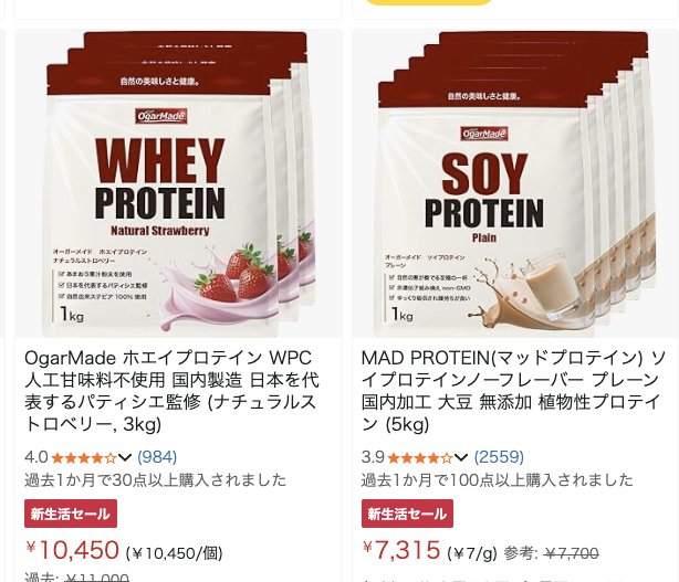 いま、ちょうどAmazon新生活セール【期間限定 3月9日まで】やってるので、プロテインが安くなってるかみてみました。