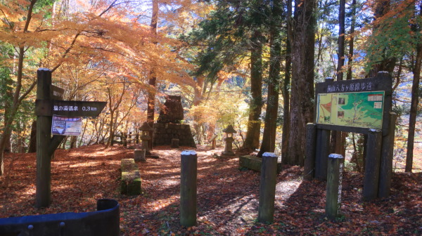 この石碑は1596年ごろ君島氏が塩の湯温泉への道を開いたことを記念して建てたもの。