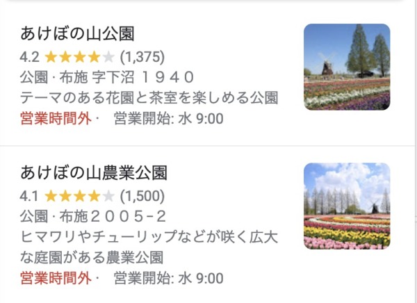 GoogleMapで「あけぼの山公園」で検索すると以下のように、あたかも風車があるような写真が表示されますが、まちがいです。